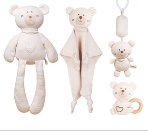Un dolcissimo set di giochi e peluche pensato per i più piccoli. Realizzato in morbido tessuto beige con dettagli a righe, è ideale per coccolare e intrattenere il neonato in totale sicurezza. Il set comprende: