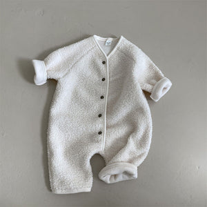 Una coccola calda e soffice per il tuo bambino! Queste tutine in stile orsetto, disponibili in delicato azzurro e crema, sono realizzate in pile effetto teddy per offrire massimo comfort e protezione nelle giornate più fredde. Il design con bottoni a pressione frontali facilita il cambio, mentre le maniche e i pantaloni risvoltabili aggiungono praticità e stile. Perfette da indossare sopra i body o come capospalla.