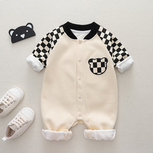 Stile sportivo e comfort si incontrano in questo adorabile pagliaccetto per neonato, caratterizzato da maniche con stampa a scacchi e un simpatico ricamo a forma di orsetto. Il design a contrasto in bianco e nero dona un look moderno e alla moda, perfetto per i piccoli esploratori. Realizzato in tessuto morbido e traspirante, offre il massimo comfort durante tutta la giornata. La chiusura con bottoni a pressione lungo la parte frontale facilita il cambio del pannolino. Un outfit pratico e originale per il tuo piccolo campione!
