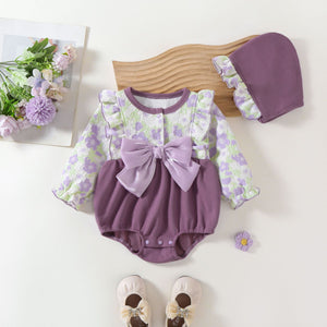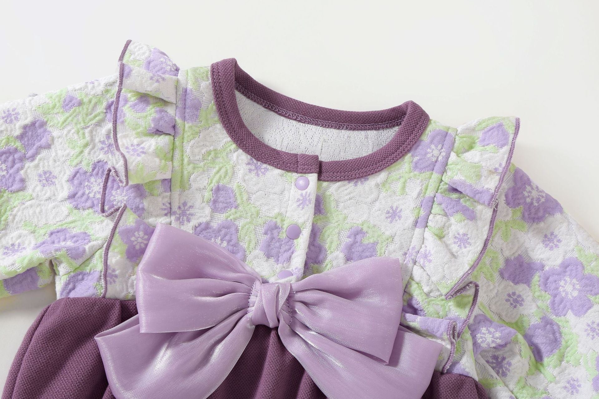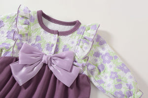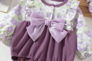 Rendi ogni momento speciale con questo meraviglioso Pagliaccetto in pizzo floreale, perfetto per la tua principessina! 💜 Il design raffinato unisce morbidi tessuti con dettagli in rilievo e un grande fiocco in raso che dona un tocco chic. Le maniche lunghe a volant e il pantaloncino bombato garantiscono il massimo comfort senza rinunciare allo stile.