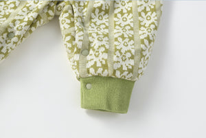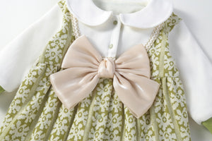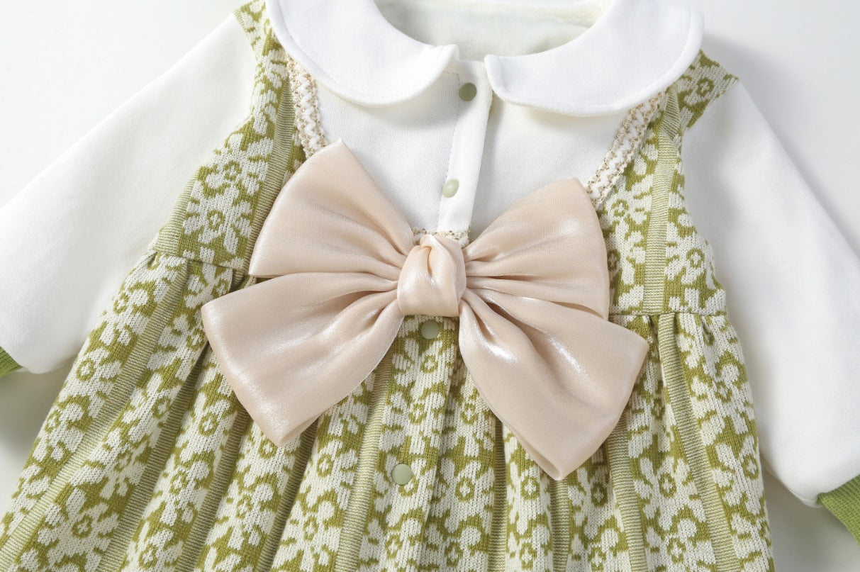 Dona al tuo piccolo un look raffinato con questa splendida tutina in stile vintage ! Realizzata in cotone morbido e traspirante , offre comfort e dolcezza in ogni momento. Il delicato motivo floreale verde e avorio , il fiocco in raso e la cuffietta coordinata la rendono perfetta per occasioni speciali o semplicemente per un tocco di eleganza quotidiana.