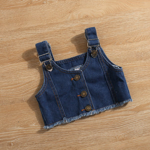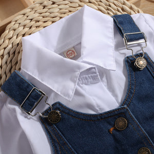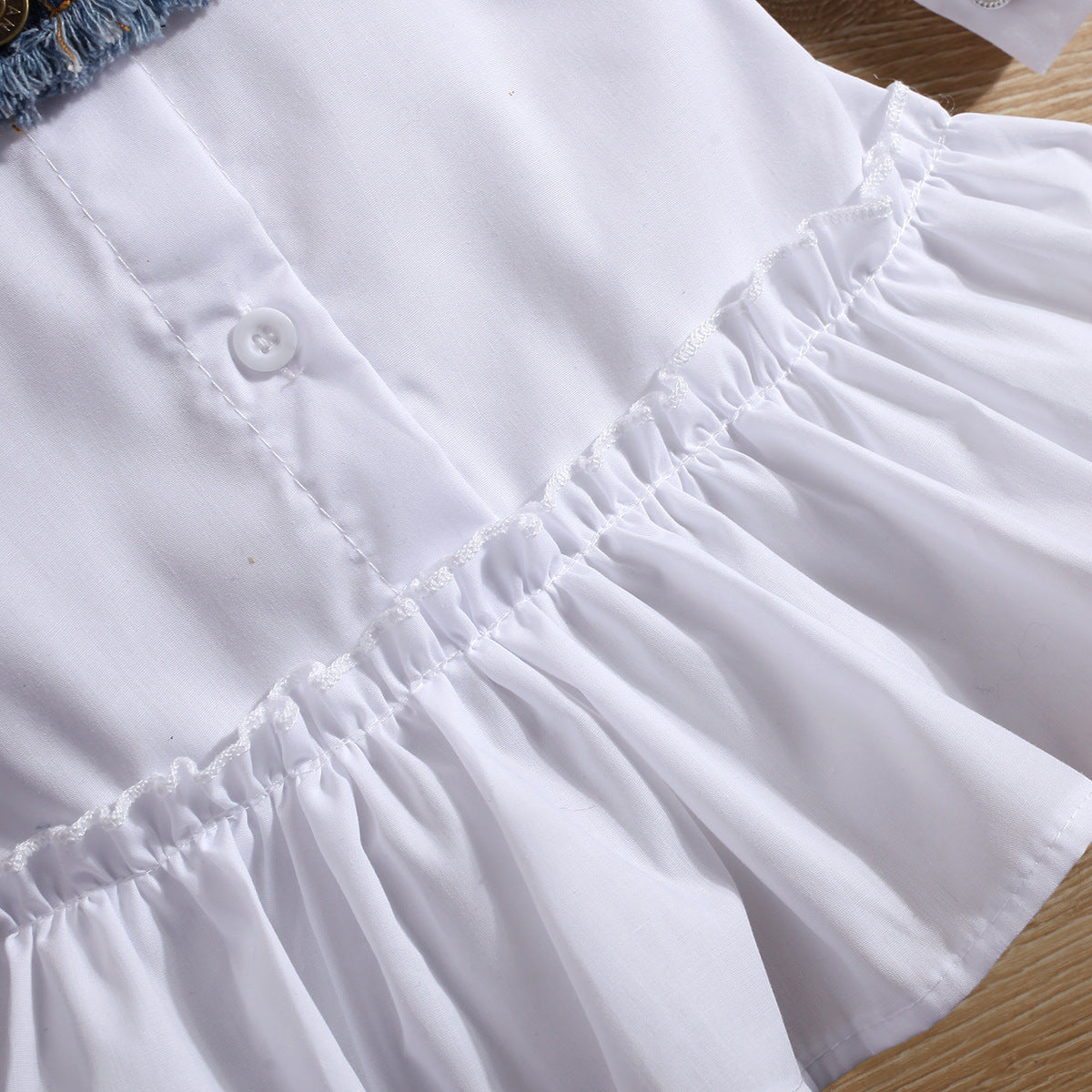 Elegante e trendy, questo abitino camicia bianca con volant sul fondo è abbinato a un gilet corto in denim con bottoni decorativi. Un look dallo stile urban chic perfetto per le piccole fashioniste che amano distinguersi! Ideale per occasioni speciali o uscite casual con un tocco glamour.