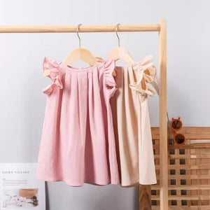 Incantevole vestitino per bambina in delicato rosa pastello, perfetto per cerimonie, feste o giornate speciali. Il design a trapezio garantisce libertà di movimento, mentre le maniche con volant aggiungono un tocco romantico e raffinato. Il tessuto leggero e leggermente strutturato dona eleganza pur restando comodo e fresco sulla pelle. Indossato con un cerchietto o ballerine, trasforma ogni piccola in una vera principessa.