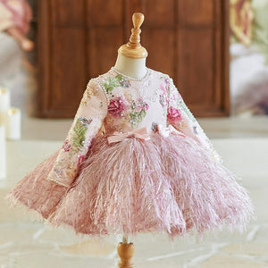 Abito Cerimonia Bambina Lussuoso – Maniche Lunghe Ricamate, Gonna in Piume e Maxi Fiocco