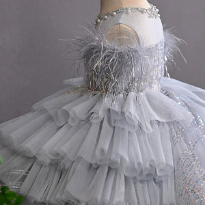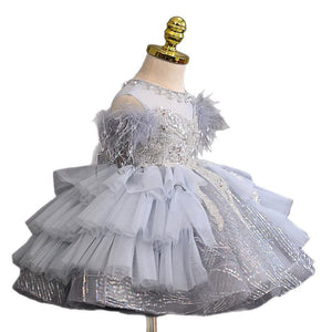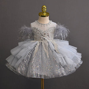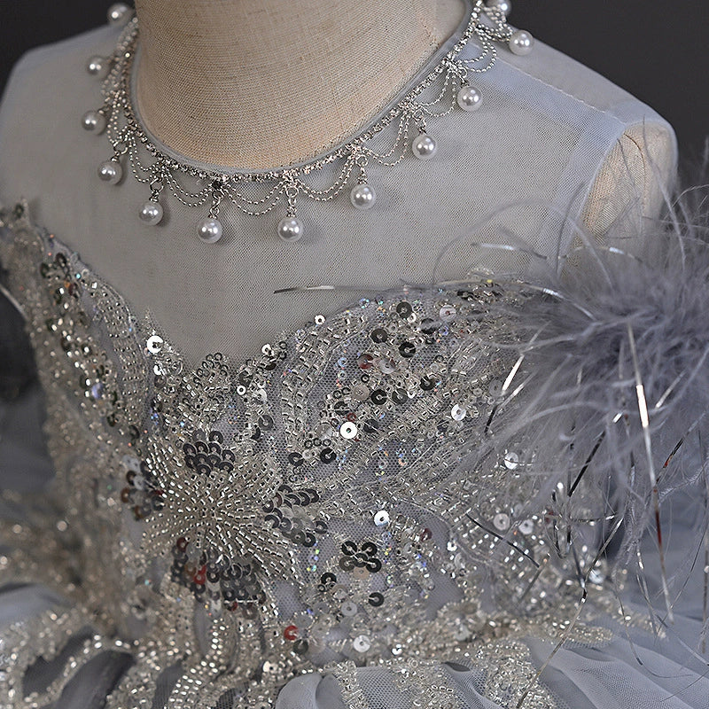 Abito da Cerimonia Bambina Argento – Con Paillettes e Piume