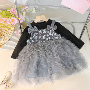 Un abito raffinato e incantevole perfetto per occasioni speciali! Questo outfit per bambina unisce una comoda maglia nera a manica lunga con una salopette decorata da fiocchetti in velluto grigio, paillettes floreali scintillanti e una voluminosa gonna in tulle arricciato. Il mix di tessuti dona eleganza e movimento, mentre la vestibilità morbida assicura comfort in ogni momento.