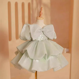 Rendi indimenticabile ogni occasione speciale con questo abito elegante da bambina. Realizzato in organza lucida a strati con maniche a sbuffo e maxi fiocco decorato con perline, offre un look principesco raffinato. Il corpetto in paillettes aggiunge un tocco di brillantezza, mentre la chiusura posteriore con zip assicura praticità e comfort. Perfetto per compleanni, matrimoni, battesimi e cerimonie.