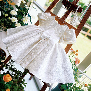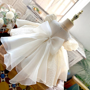 Le maniche a sbuffo e la gonna ampia e strutturata donano un tocco principesco, mentre il grande fiocco in organza sul retro regala un effetto raffinato e scenografico, perfetto per cerimonie, battesimi, compleanni o eventi speciali.