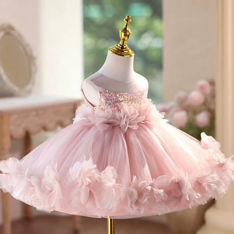 Trasforma la tua piccola in una vera principessa con il nostro abito elegante da cerimonia per bambina. Realizzato in morbido tulle rosa, presenta una gonna ampia e vaporosa impreziosita da applicazioni floreali 3D, perfetta per rendere speciale ogni occasione.