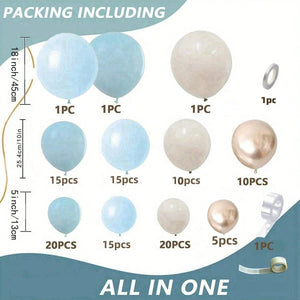 Il set include palloncini di diverse dimensioni e tonalità (azzurro cielo, bianco perla e oro satinato), per un effetto tridimensionale armonioso e raffinato.