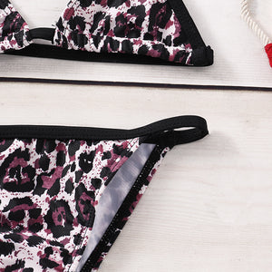 Il top a triangolo con spallina regolabile si abbina allo slip con elastico in vita, il tutto in una vivace fantasia leopardata nei toni del fucsia, nero e bianco.