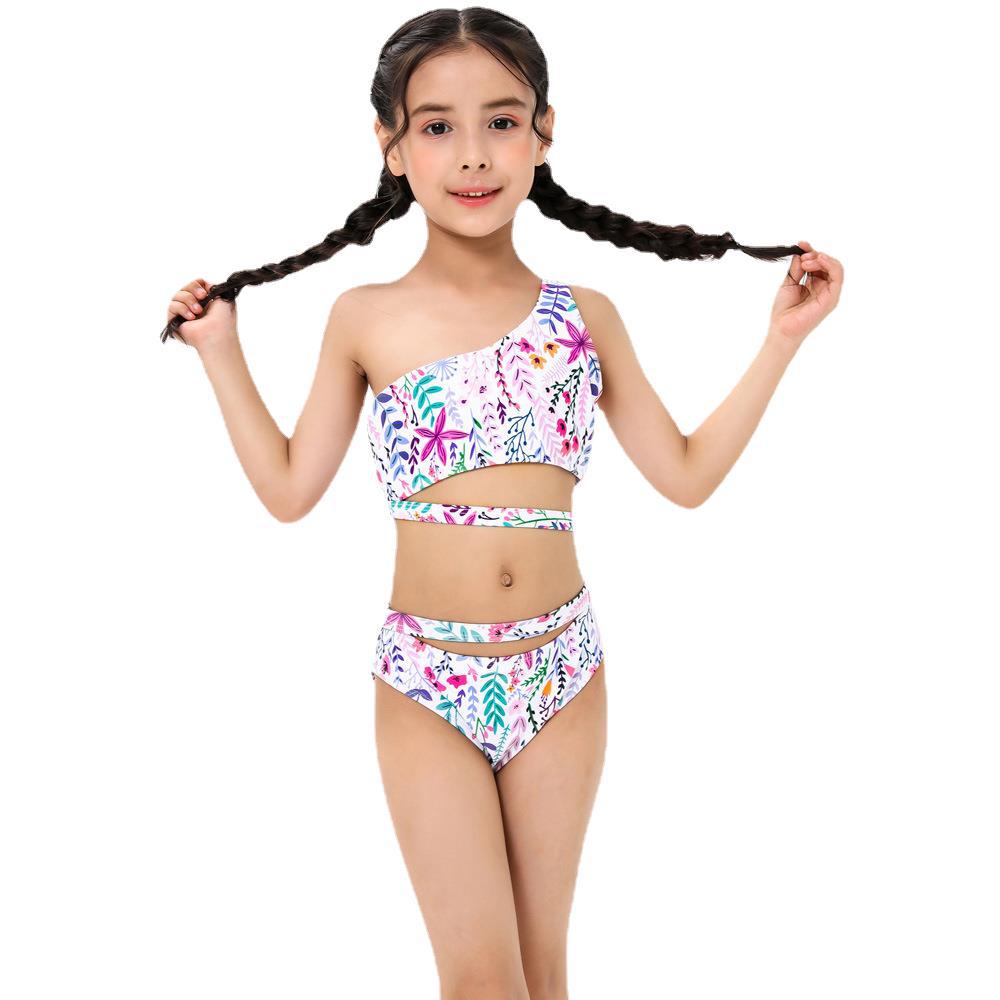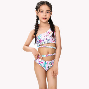 Questo originalissimo bikini da bambina con top monospalla è decorato da una coloratissima stampa tropicale e arricchito da doppi cinturini che donano un tocco moderno e grintoso.