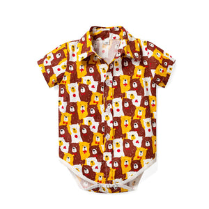 Un'esplosione di tenerezza e colore per il guardaroba estivo del tuo piccolo! Questo body a camicia con maniche corte è decorato con una simpatica stampa all-over di orsetti in diverse tonalità, perfetto per aggiungere allegria ai look quotidiani. Il colletto classico e l’abbottonatura frontale donano un tocco elegante, mentre la chiusura con bottoni a pressione sul fondo garantisce praticità durante il cambio. Realizzato in tessuto leggero e traspirante, è ideale per le giornate calde.