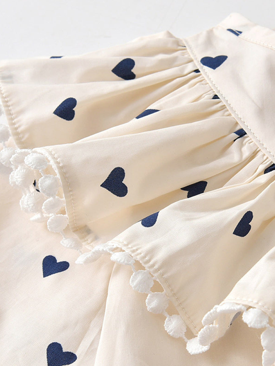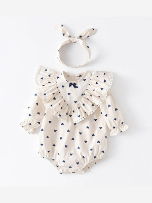 Un completo dolcissimo e romantico per le tue piccole principesse! Questo body a manica lunga color panna è decorato con una delicata fantasia di cuoricini blu e arricchito da un ampio colletto volant con bordo in pizzo e un mini fiocchetto al centro. Completato da una fascia abbinata con fiocco, è perfetto per cerimonie, servizi fotografici o occasioni speciali.
