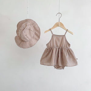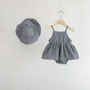 Adorabile completo estivo in stile vichy, composto da romper con gonnellina integrata e cappellino coordinato. Disponibile in due varianti colore – beige e blu navy – questo outfit è l’ideale per le passeggiate al parco o una giornata in spiaggia. Il tessuto leggero e traspirante garantisce comfort e libertà di movimento.