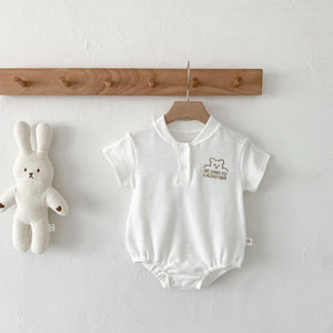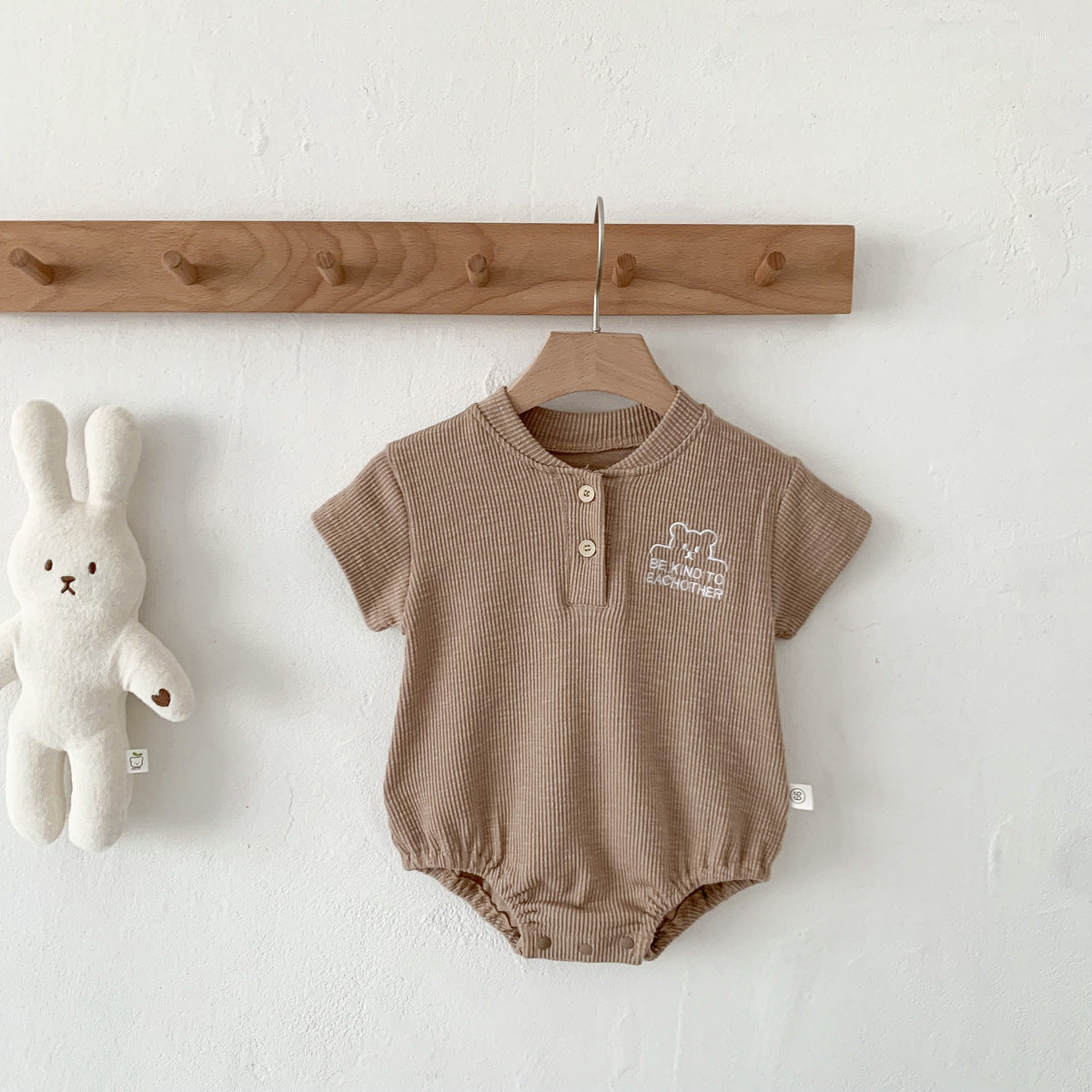 Body a maniche corte per neonati in tessuto waffle leggero e traspirante, ideale per la stagione calda. Disponibile in due tonalità neutre e moderne: bianco e beige. Presenta un piccolo ricamo con un orsetto e la frase “Be kind to each other” sul petto. Chiusura con bottoncini frontali e automatici al cavallo per facilitare il cambio