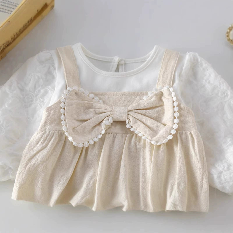 Romantico e raffinato, questo body tutina per neonata è perfetto per le occasioni speciali o per donare un tocco elegante al quotidiano. Realizzato in morbido cotone traspirante, presenta un adorabile fiocco centrale con bordo in pizzo e maniche lunghe in tessuto floreale leggermente trasparente, che aggiungono un tocco di dolcezza e delicatezza.