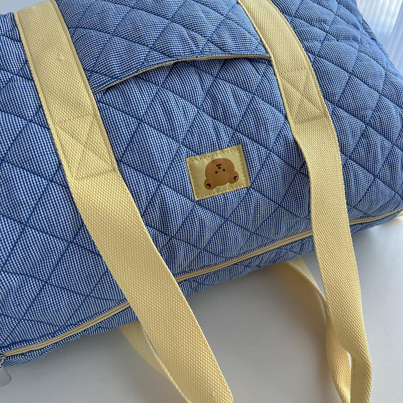 Home Borsa da viaggio trapuntata azzurra con manici gialli e patch orsetto