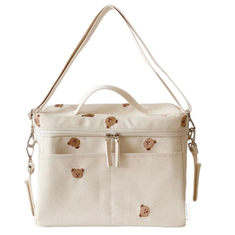Pratica e capiente borsa in tessuto beige decorata con simpatici orsetti ricamati. Dotata di manico e tracolla regolabile per il massimo comfort, è perfetta per portare con sé tutto l’occorrente del bebè: pannolini, biberon, salviette e accessori. Grazie alle tasche esterne e interne, mantiene sempre tutto in ordine e a portata di mano.