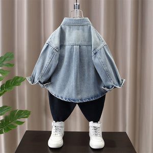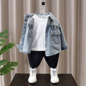 Stile urbano e comfort si uniscono in questo completo casual per bambino. Composto da una giacca in denim effetto slavato con bottoni automatici e tasche frontali, una t-shirt bianca basic e pantaloni neri morbidi dal taglio ampio. Un outfit versatile perfetto per la mezza stagione, ideale per passeggiate in città o giornate all'aperto. Facile da abbinare e comodo da indossare, è la scelta giusta per un look trendy e pratico allo stesso tempo!