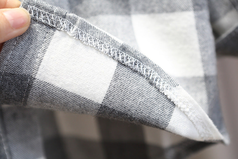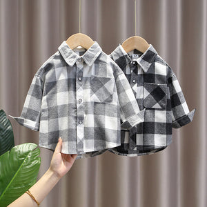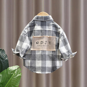 Look trendy e comodità assicurata con questa camicia a quadri per bambini, perfetta per la mezza stagione. Realizzata in morbido cotone, presenta maniche arrotolabili, vestibilità oversize e una patch decorativa sul retro con scritta “GDJY”. Disponibile in due varianti di colore (grigio chiaro e grigio scuro), è ideale da indossare aperta sopra una t-shirt o chiusa come camicia classica. Un capo versatile per look casual e alla moda!