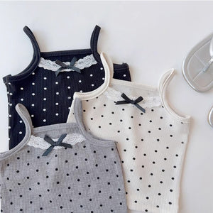 Canottiere Bambina in Cotone a Pois con Fiocco e Pizzo