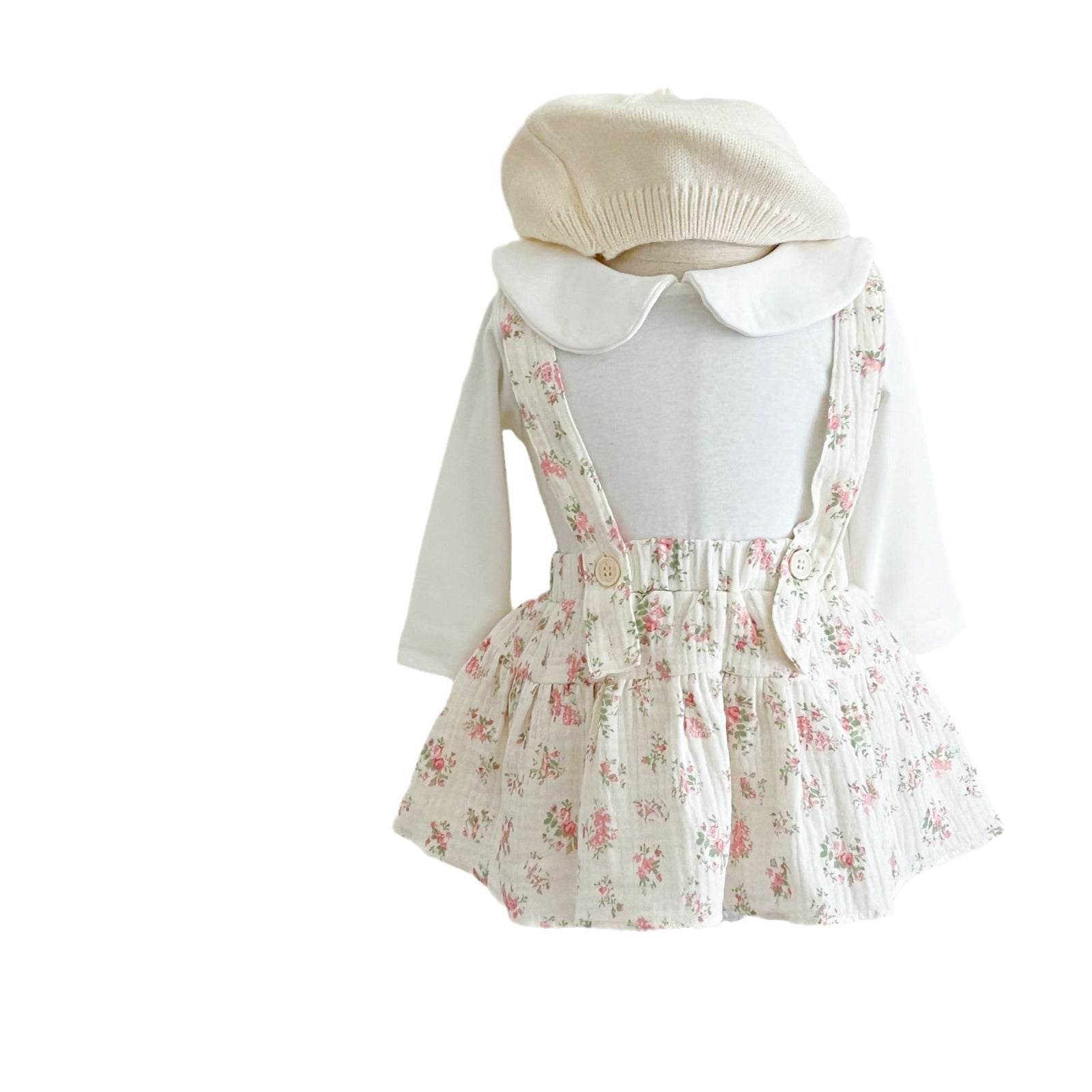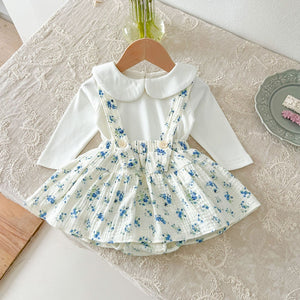 Questo adorabile completo da bambina è perfetto per la primavera e l’autunno. Composto da una camicia a maniche lunghe con elegante colletto Peter Pan e da una salopette con bretelle e gonna arricciata, è disponibile in tre romantiche fantasie floreali: rosa, verde e blu. Il tessuto in cotone morbido garantisce comfort e libertà di movimento. Un look delicato e raffinato, ideale per cerimonie, passeggiate o momenti speciali.