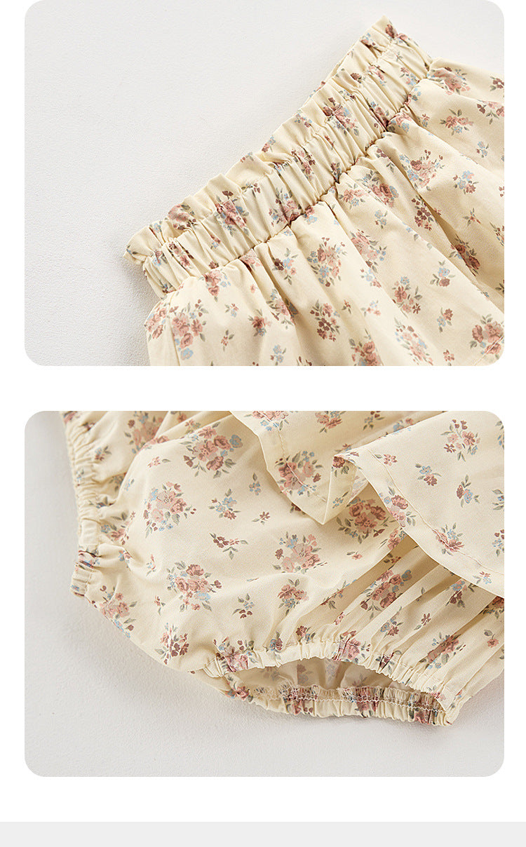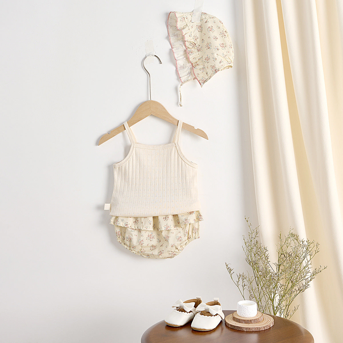Un coordinato romantico e fresco pensato per le giornate più calde! Questo completo estivo da 3 pezzi include una canottiera in cotone a costine con dettaglio floreale sullo scollo, un bloomers con doppia balza e fantasia a piccoli fiori, e un adorabile cappellino coordinato con laccetto. Il design comodo e leggero garantisce il massimo comfort alla tua bimba, mantenendo uno stile raffinato e naturale. Perfetto per passeggiate, servizi fotografici e giornate all’aperto.