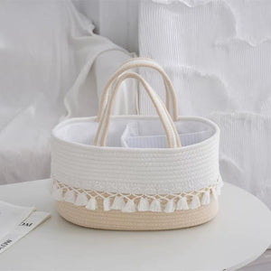 Pratico e raffinato cestino portaoggetti in corda intrecciata, ideale per organizzare gli spazi della cameretta, del bagno o del soggiorno. Dotato di comodi manici per il trasporto e interno con divisori per mantenere tutto in ordine, unisce funzionalità e design boho chic con eleganti dettagli decorativi a nappine.