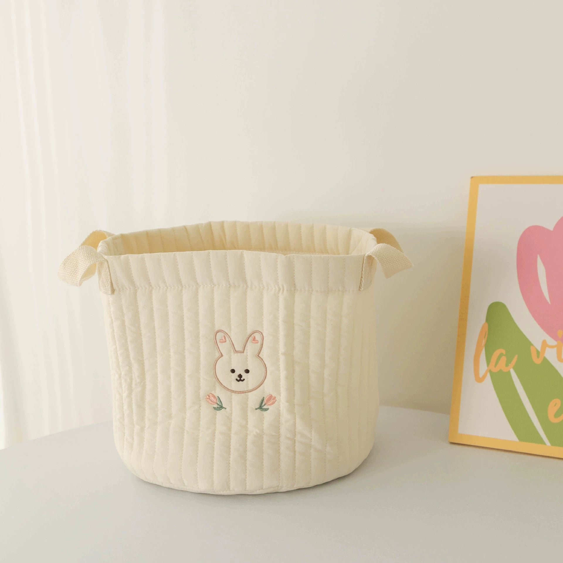Dolcissimo cestino portaoggetti in tessuto trapuntato, perfetto per organizzare la cameretta del tuo bambino con stile e praticità. Realizzato in cotone morbido e resistente, presenta una texture a righe verticali e grazioso ricamo a forma di coniglietto.