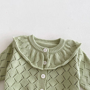 Eleganza e comfort per le più piccole! Questo cardigan per neonata è realizzato in morbida maglia di cotone traforata con delicata lavorazione a rombi. Il colletto a volant aggiunge un tocco raffinato e romantico, perfetto per occasioni speciali o per donare charme ai look quotidiani. Disponibile in due tenui tonalità pastello – panna e verde salvia – è un capo versatile da indossare in ogni stagione. Chiusura frontale con bottoni per una vestibilità pratica e veloce.