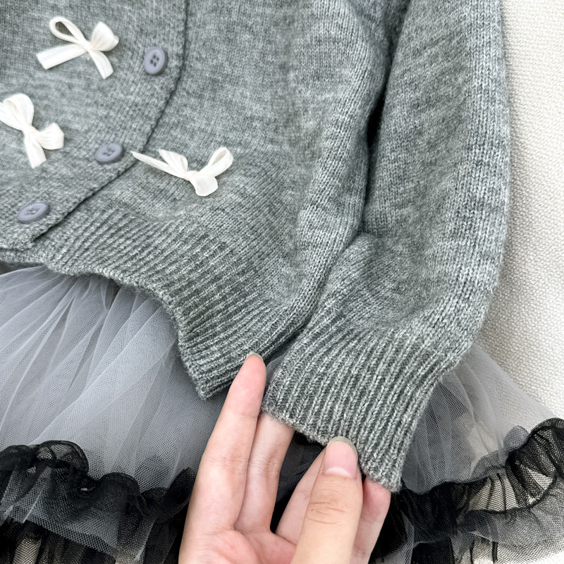 Home Completo Bimba Elegante Invernale Cardigan Grigio con Fiocchi e Gonna in Tulle