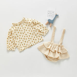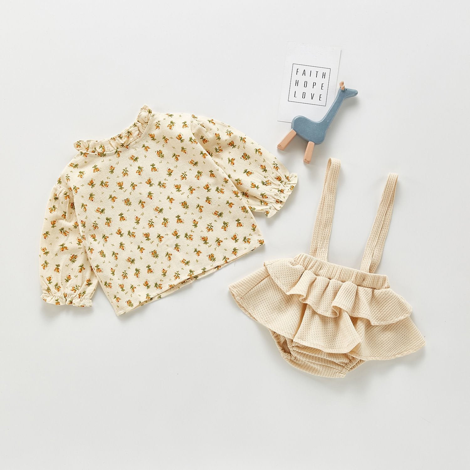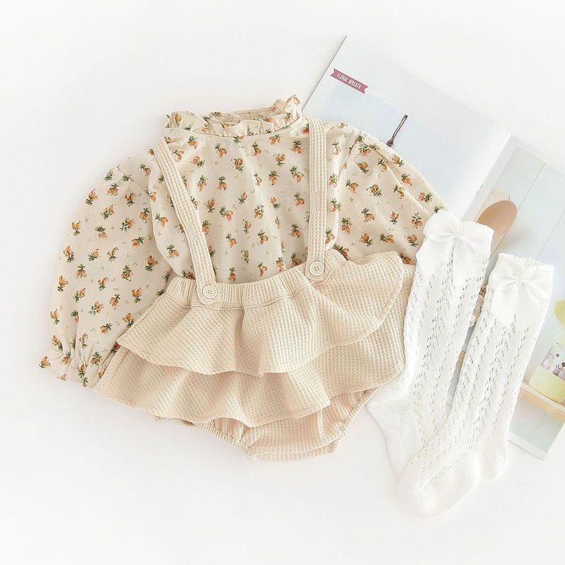 Un look adorabile e raffinato per le giornate primaverili ed estive! Questo completo da neonata include una blusa a maniche lunghe con fantasia floreale e colletto volant, abbinata a bloomers con doppia balza in tessuto a nido d’ape e pratiche bretelle con bottoncini. Completano l’outfit delle calze traforate con fiocco in tinta, perfette per un tocco elegante e romantico. Disponibile in due varianti colore: beige con accessori panna e beige con accessori cioccolato.