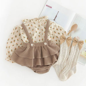 Home Completo 3 Pezzi Neonata – Blusa a Fiori, Bloomers con Bretelle e Calze con Fiocco