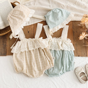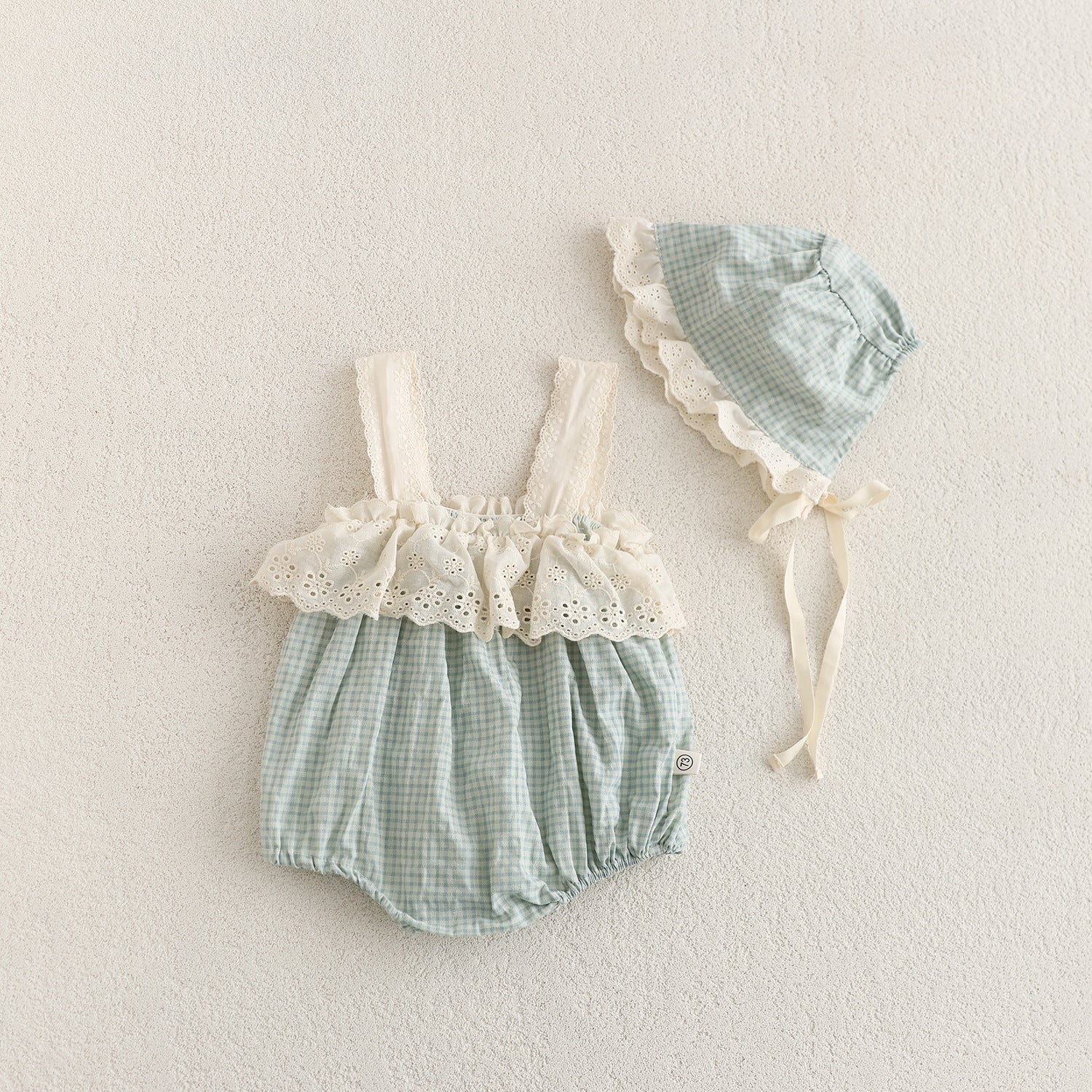 Delizioso set estivo composto da pagliaccetto a quadretti vichy con bretelle in pizzo sangallo e cappellino coordinato. Un look fresco, romantico e super comodo per le giornate calde!