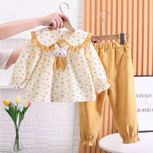 Completo Bambina “Bunny Chic” – Blusa a Fiori con Coniglietto + Pantaloni Coordinati
