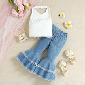 Completo Bambina Top Elegante Bianco e Jeans a Zampa con Volant