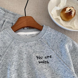 • Felpa grigia melange con scritta ricamata "You are worth" sul petto, maniche raglan e fondo elasticizzato.
