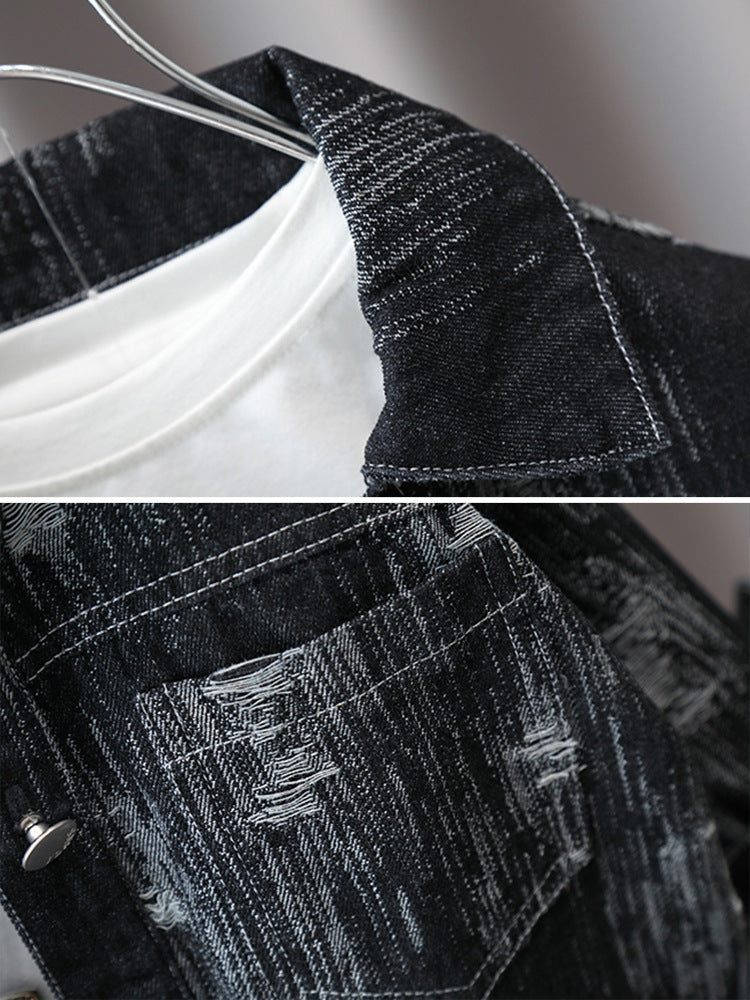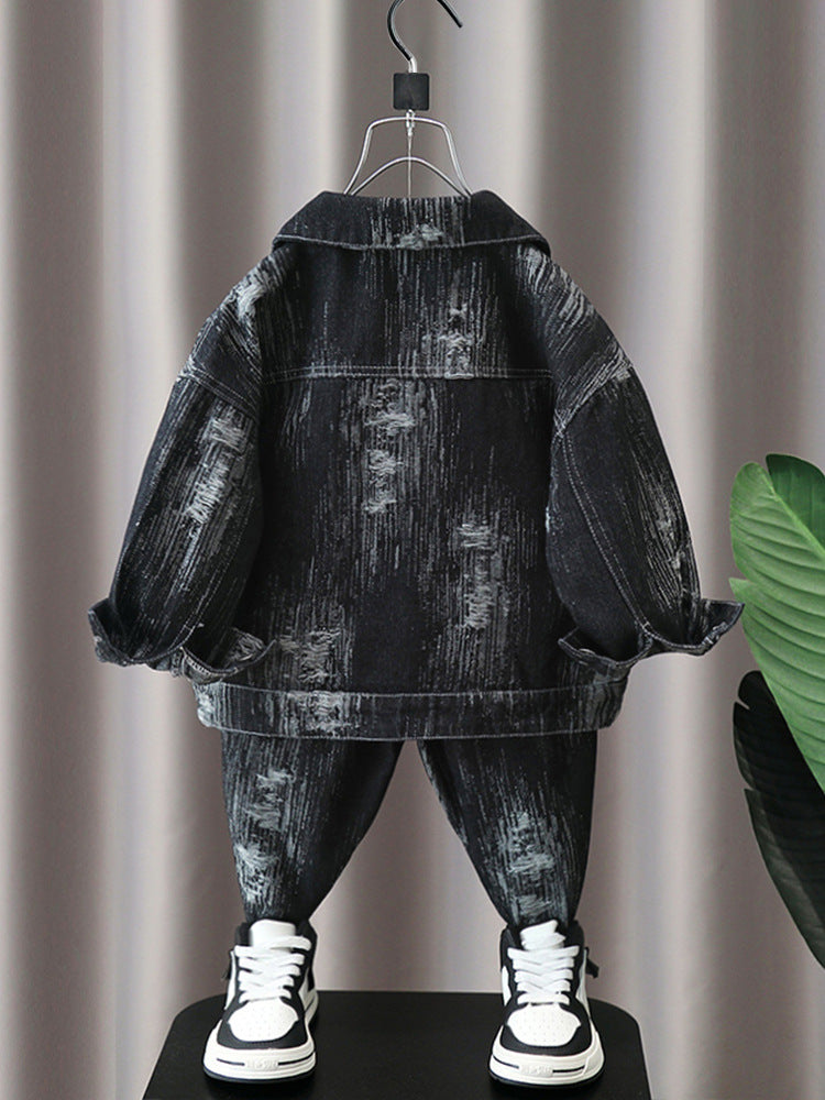Completo casual in denim per bambini, composto da giacca e pantaloni coordinati con effetto slavato. Un outfit pratico e alla moda, perfetto per la primavera e l’autunno.