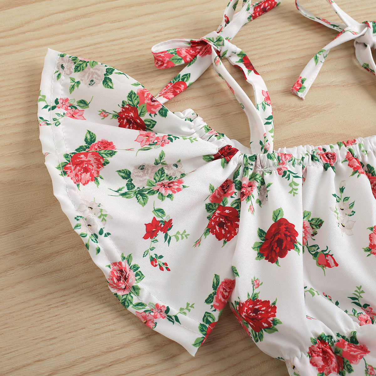 Freschezza e stile per l’estate con questo delizioso completo a due pezzi per bambina! Il set include un top a spalle scoperte con maniche volant e fiocchetti regolabili, decorato con una romantica stampa floreale rossa su fondo bianco. I pantaloncini a vita alta, bianchi e leggeri, sono impreziositi da una cintura abbinata con lo stesso motivo floreale.
