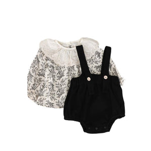 Completo bimba blusa floreale con colletto ricamato + salopette nera