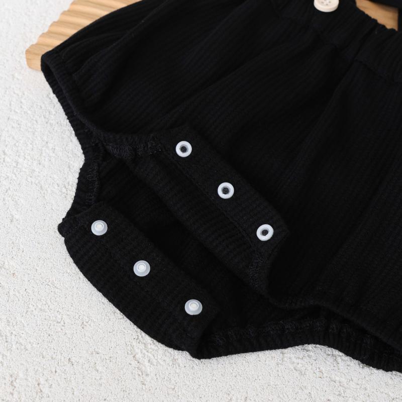 Salopette nera con bretelline regolabili e bottoni decorativi, pratica chiusura con automatici al cavallo.