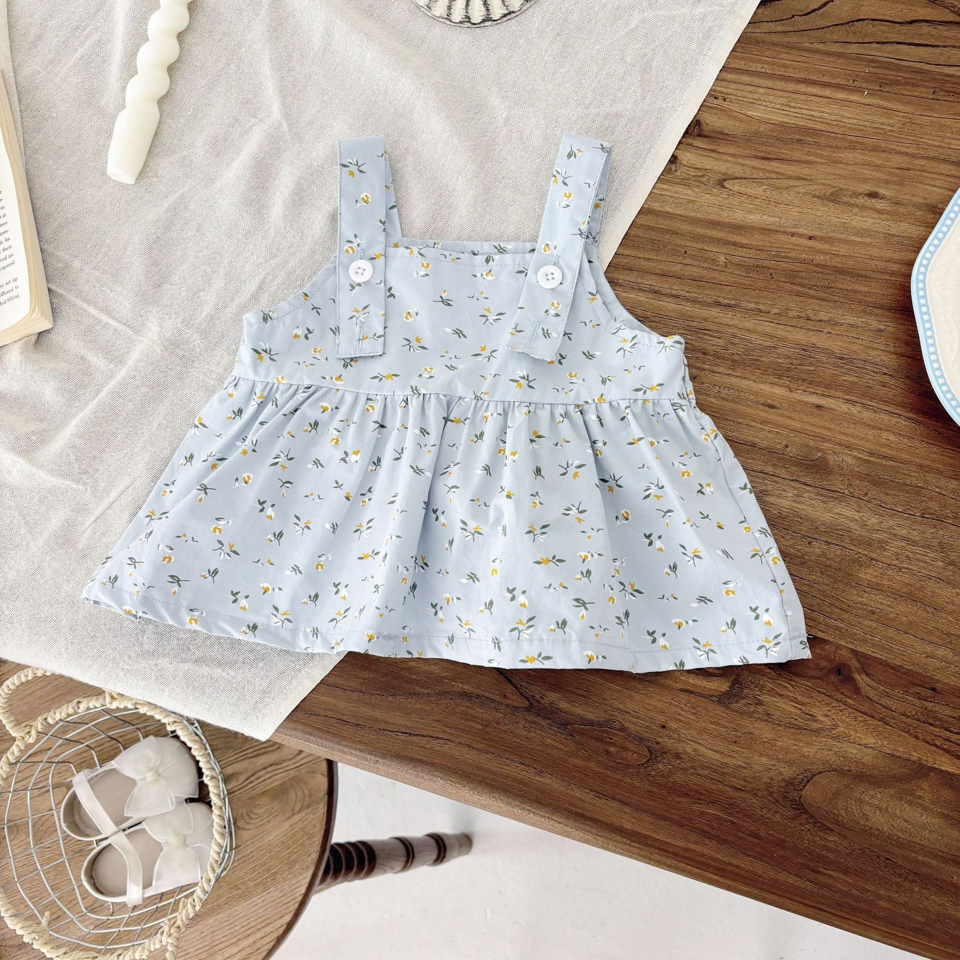 Incantevole completo per bambina composto da un body a costine color panna con maniche corte in tulle trasparente e una graziosa salopette azzurra con stampa floreale gialla. Il design con bretelle e bottoncini dona un tocco raffinato e romantico, perfetto per la primavera e l'estate. Il body include bottoncini automatici sul fondo per una vestibilità comoda e pratica durante il cambio. Ideale per cerimonie, passeggiate o momenti speciali.