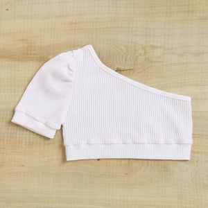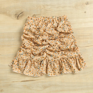 Un outfit romantico e super trendy per la tua piccola fashion lover! Questo completo include un top bianco a costine con design monospalla e manica corta a sbuffo, abbinato a una gonna leggera color pesca con stampa floreale e balze arricciate.