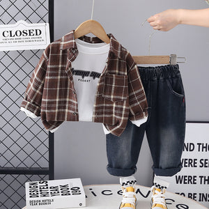 Perfetto per un look rilassato ma alla moda! Questo completo bimbo è composto da una camicia a quadri marrone, una t-shirt bianca con stampa e jeans denim scuro elasticizzati. Comodo e versatile, è ideale per ogni giorno: scuola, uscite in famiglia o momenti di gioco.