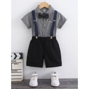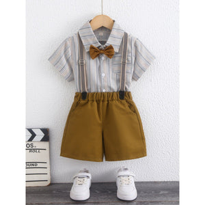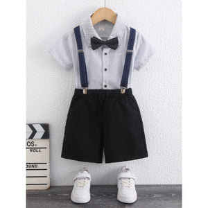 Questo completo è composto da camicia a righe con papillon, pantaloncini eleganti e bretelle regolabili. Perfetto per cerimonie, feste o shooting fotografici!