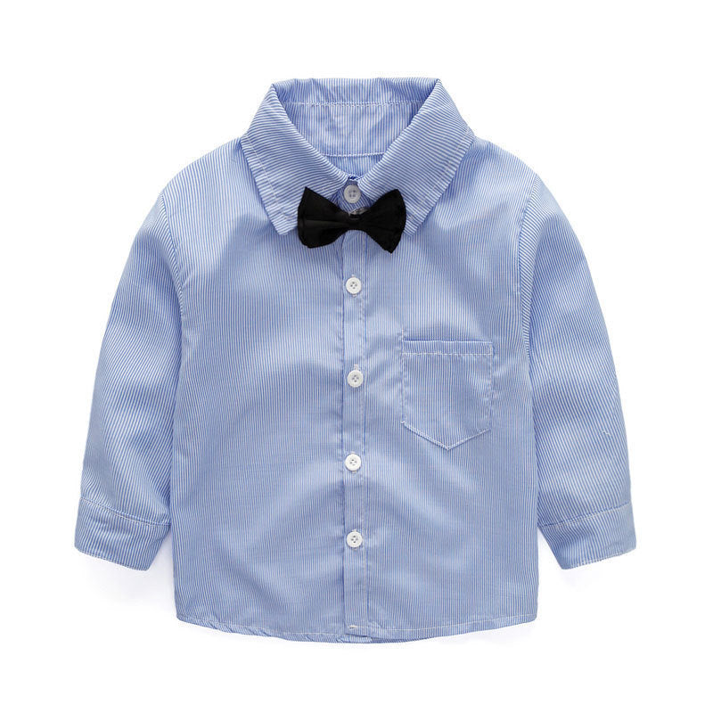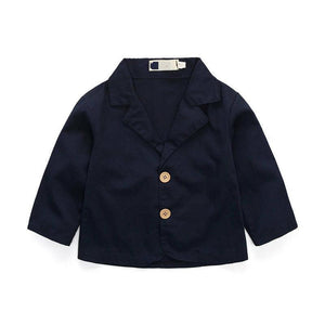 Composto da una giacca blu navy con bottoni, una camicia azzurra con papillon nero e pantaloni color beige, questo set è perfetto per cerimonie, battesimi, matrimoni o feste speciali.