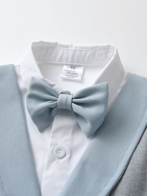 Un outfit raffinato e irresistibile per i piccoli protagonisti delle grandi occasioni! Questo completo elegante da bambino include una camicia bianca a maniche lunghe, un gilet grigio chiaro con dettagli azzurri, un papillon coordinato e pantaloni azzurri dal taglio classico. Perfetto per battesimi, matrimoni, cerimonie e feste speciali. Comfort e stile si uniscono in un look impeccabile!