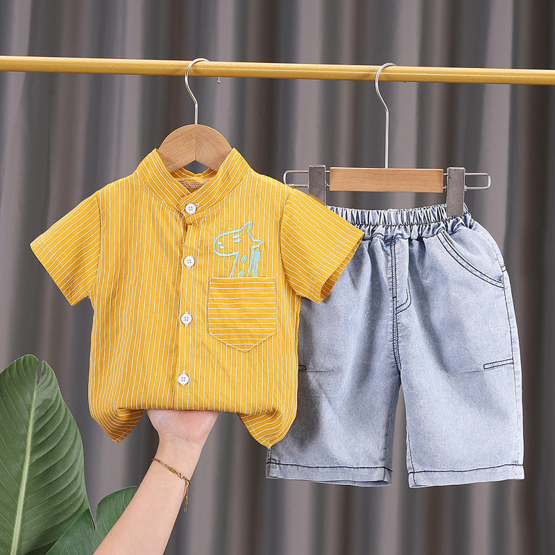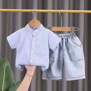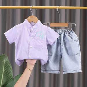 Completo Estivo Bambino - Camicia Coreana a Righe e Shorts in Denim