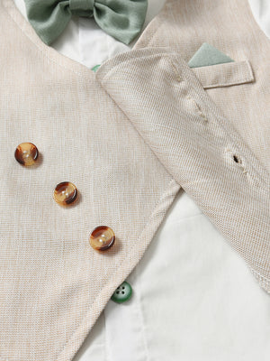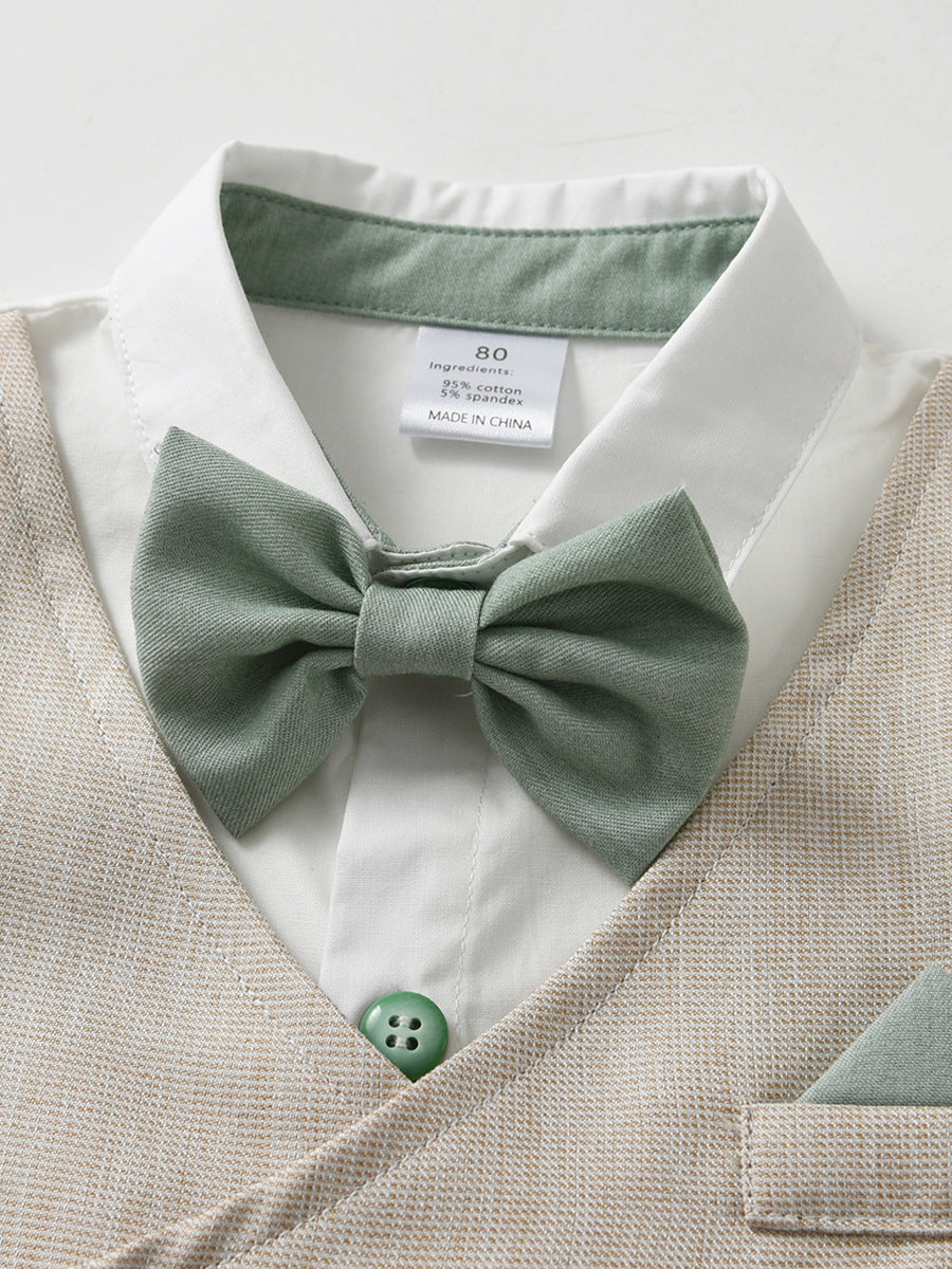 Perfetto per cerimonie e occasioni speciali, questo raffinato completo da neonato 3 pezzi conquisterà tutti con il suo stile elegante e delicato. Include una camicia bianca a maniche lunghe, un gilet beige con chiusura asimmetrica e dettagli come il fazzolettino sul petto, e pantaloni verde salvia coordinati. Il papillon in tinta completa il look con un tocco di classe.